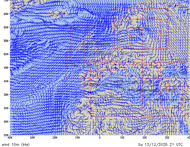 Sa, 13 Dec, 21:00 GMT Wind Barb Scale and Beaufort Scale with wind speed (knots, m/s, km/hr, miles/hr) and Descriptions